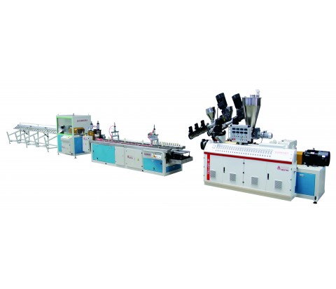 生產(chǎn)線由錐形雙螺桿擠出機(jī)、真空定型臺(tái)、切割機(jī)、翻料架組成。