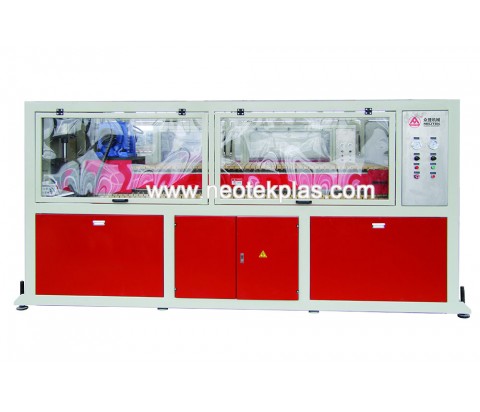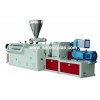 生產線采用SJZ錐形雙螺桿擠出機,輔機由真空定徑臺、牽引機、切割機及推料架組成。